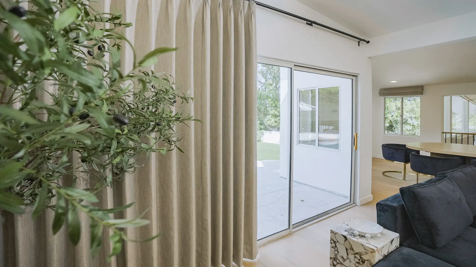 Spaces with a more relaxed, organic style benefit from texture and natural materials. Woven Wood Shades bring in warmth and dimension, while Linen Curtains or textured fabrics softens the look and adds an easy, lived-in feel. These options work well on sliding glass doors when you want to maintain a casual, inviting atmosphere without sacrificing function.