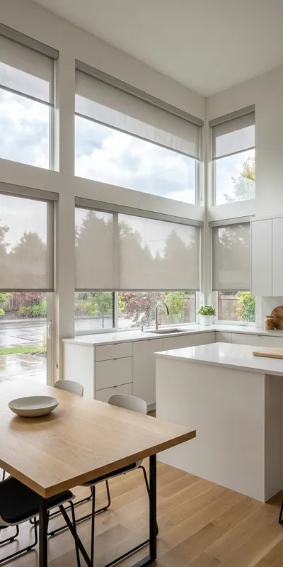 Solar and light-filtering Roller Shades soften shifting Northwest light, reducing screen glare while maintaining outside views, perfect for home offices, media rooms, and open living areas that face frequent overcast brightness.